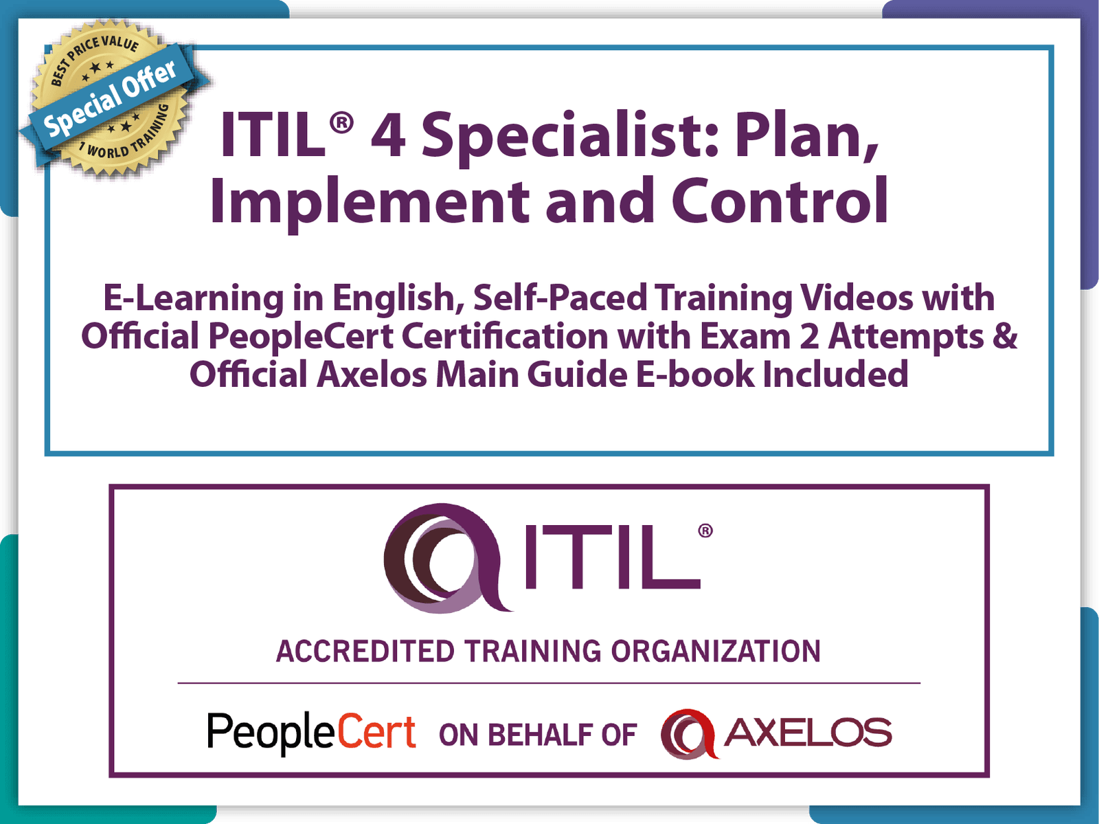 The ITIL 4 Specialist: Plan, Implement and Control combined practice module is for IT professionals aiming to establish good cross-practice collaboration and effective service value streams. The individuals can demonstrate their understanding and application of the key concepts covered in the five ITIL Management Practices at both strategic and operational levels, maximising value from these practices. These are namely: ITIL 4 Change Enablement Practice, ITIL 4 Deployment Management Practice, ITIL 4 Release Management Practice, ITIL 4 Service Configuration Management Practice, and ITIL 4 IT Asset Management Practice.