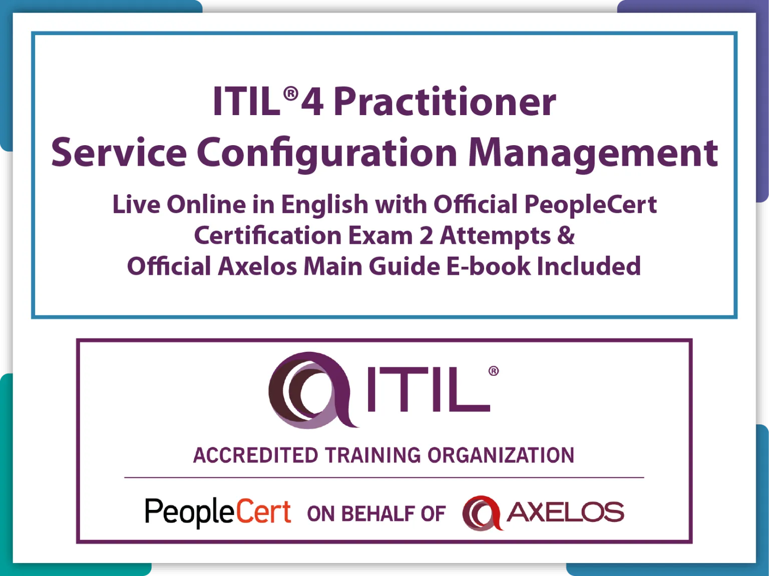 ITIL® 4 Practitioner: Service Configuration Management Practice Live Online in English with Official PeopleCert Certification Exam 2 Attempts & Official Axelos Main Guide E-book Included.